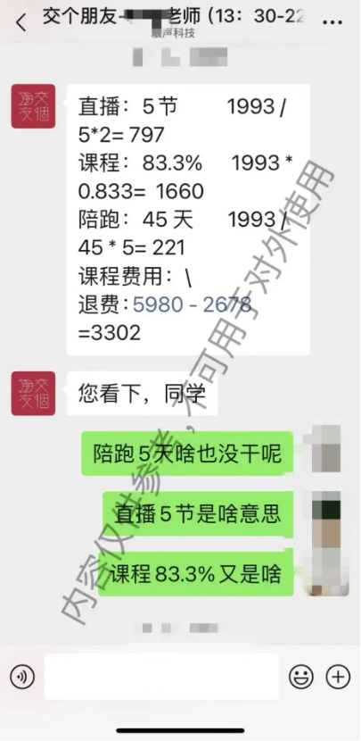 基于对课程交付效果的不满意,该学员向交个朋友方面提出退款要求。“扣费标准在报名环节没有提前说明,后来我被告知只能按比例退款,5980元只能退费3302元,5天在群内只问了3个问题,说了20几句话,最后消费2678元,而且报名缴费过程没有签署任何协议或合同,也没有开发票。”该学员说道。
