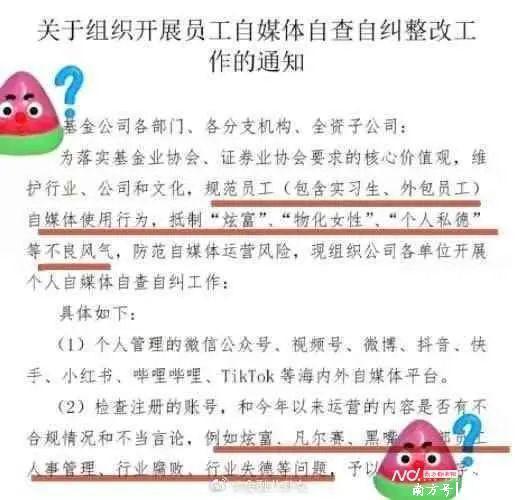 本文自南都·湾财社十大股票配资平台网址。 采写|南都·湾财社记者 罗曼瑜 编辑|刘耀宁王琦璋 7月31日,有市场消息称,基金公司组织开展员工自媒体自查自纠整改工作,要求检查注册的账号和运营的内容是否有不合规的情况,例如炫富、凡尔赛、黑嘴、行业失德等问题。 网传截图 针对上述传闻,南都·湾财社记者询问了多家头部公募基金的内部人士,多位公募人士均向记者表示暂未收到此类书面通知。“我们最近没有特地自查这些东西,实际上这类工作基金公司长期以来都有在做,我司在这块的合规要求一直蛮严格。”某不愿具名的公募...