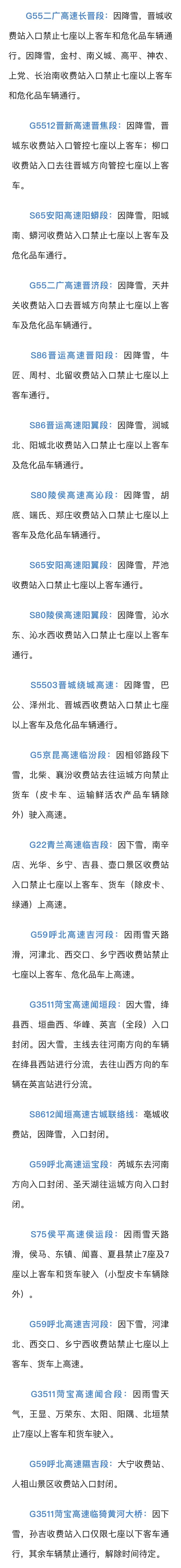 另据@河南高速公安 消息,因雨雪雾,郑州市、洛阳市、平顶山市、三门峡市域部分路段禁止所有车辆上站;因雨雪雾,开封市、平顶山市、周口市域部分路段禁止危险品运输车辆上站;因雨雪雾,开封市、许昌市、三门峡市域部分路段禁止九座(含九座)以上客车及危险品运输车辆上站;因雨雪雾,郑州市、洛阳市、许昌市、驻马店市、济源市域部分路段禁止七座(含七座)以上客车及危险品运输车辆上站;因事故,平顶山市域部分路段禁止车辆上站。其他高速公路正常通行。